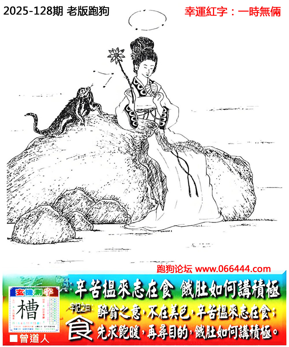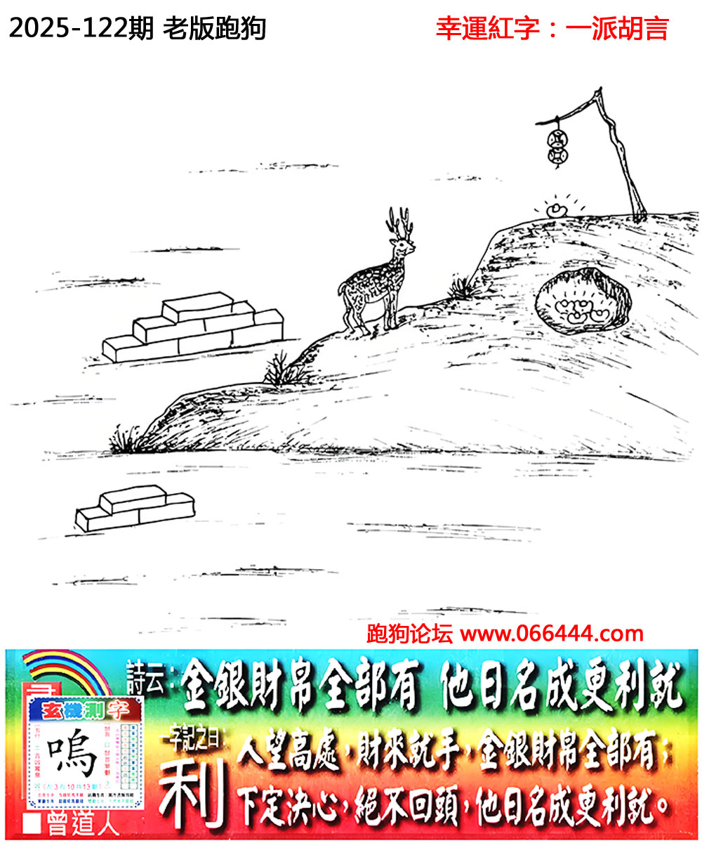 122期老版跑狗一字記之曰:【利】 詩雲:金銀財帛全部有,他日名成更利就。 人望高處,財來就手,金銀財帛全部有; 下定決心,絕不回頭,他日名成更利就。 玄機測字:《鳴》