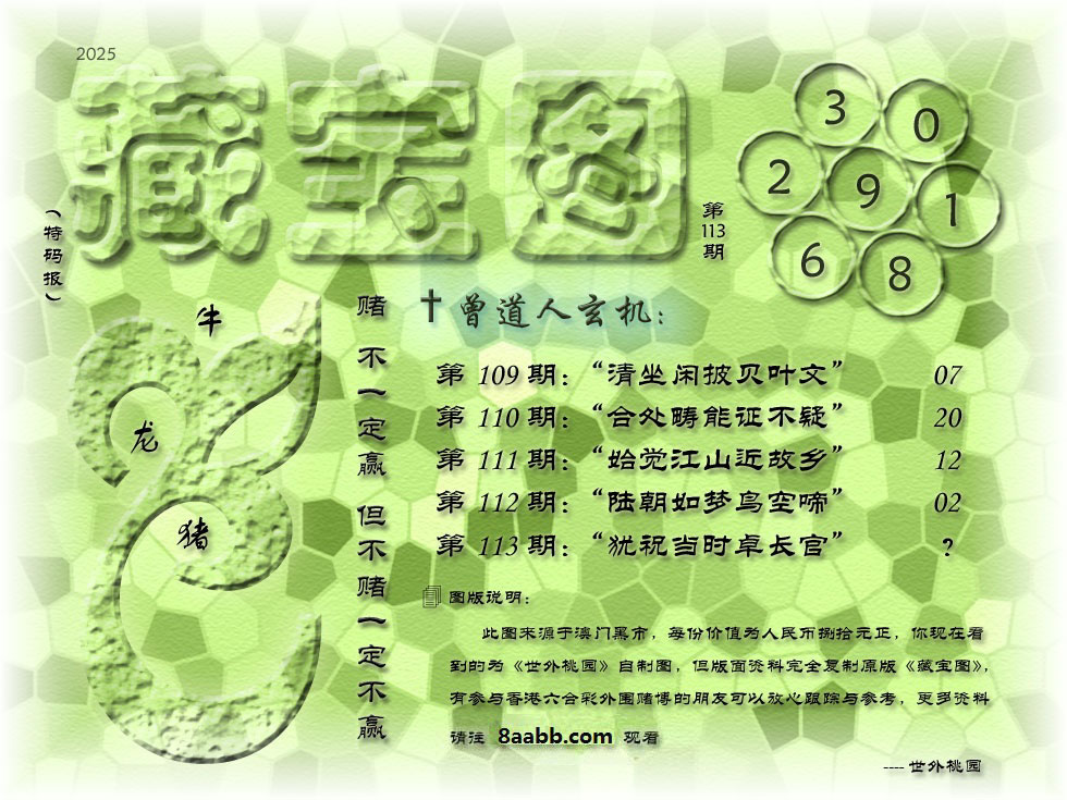 112期藏寶圖 新:陆朝如梦鸟空啼 老:芳意潜消又壹春 禁:猪 禁:8尾 玄機字:《饩》开02龙