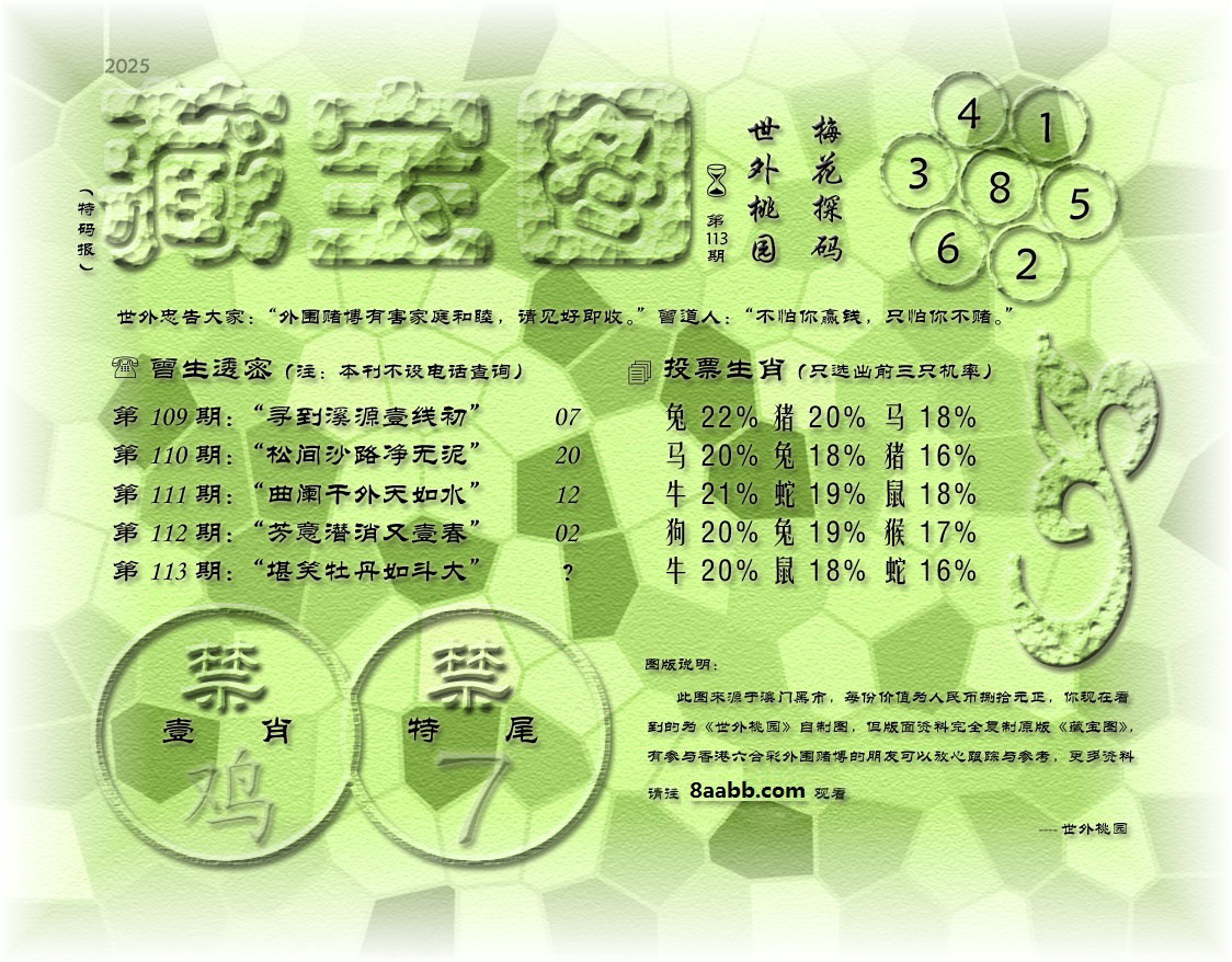 113期藏寶圖 新:犹祝当时卓长官 老:堪笑牡丹如斗大 禁:鸡 禁:7尾 玄機字:《抬》