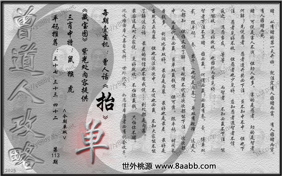031期藏寶圖 新:闻道长江日夜流 老:穆满曾为物外游 禁:猴 禁:7尾 玄機字:《合》开34猴