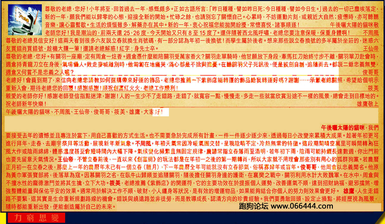 【3】.尊敬的老總見信安好!這兩天看到很多六友説立春就換生肖號碼,有一部分認為年初一後換號!而學生屬於後者。想來那些説立春換號的多半屬於坐莊的,迷惑六友買錯肖買錯號,趁機大赚一筆!還請老總解惑!紅字:身先士卒。