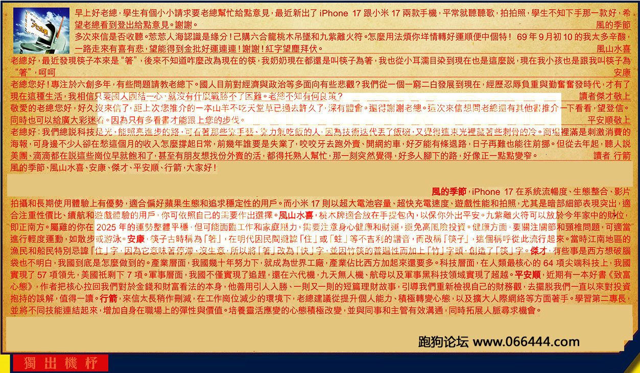 【5】.敬愛的老總您好,好久沒來信了,距上次您推介的一本山羊不吃天堂草已過去許久了,深有體會。還得謝謝老總。這次來信想問老總還有其他書推介一下看看,望登信。同時也可以給廣大彩迷看。因為只有多看書才能跟上您的步伐。