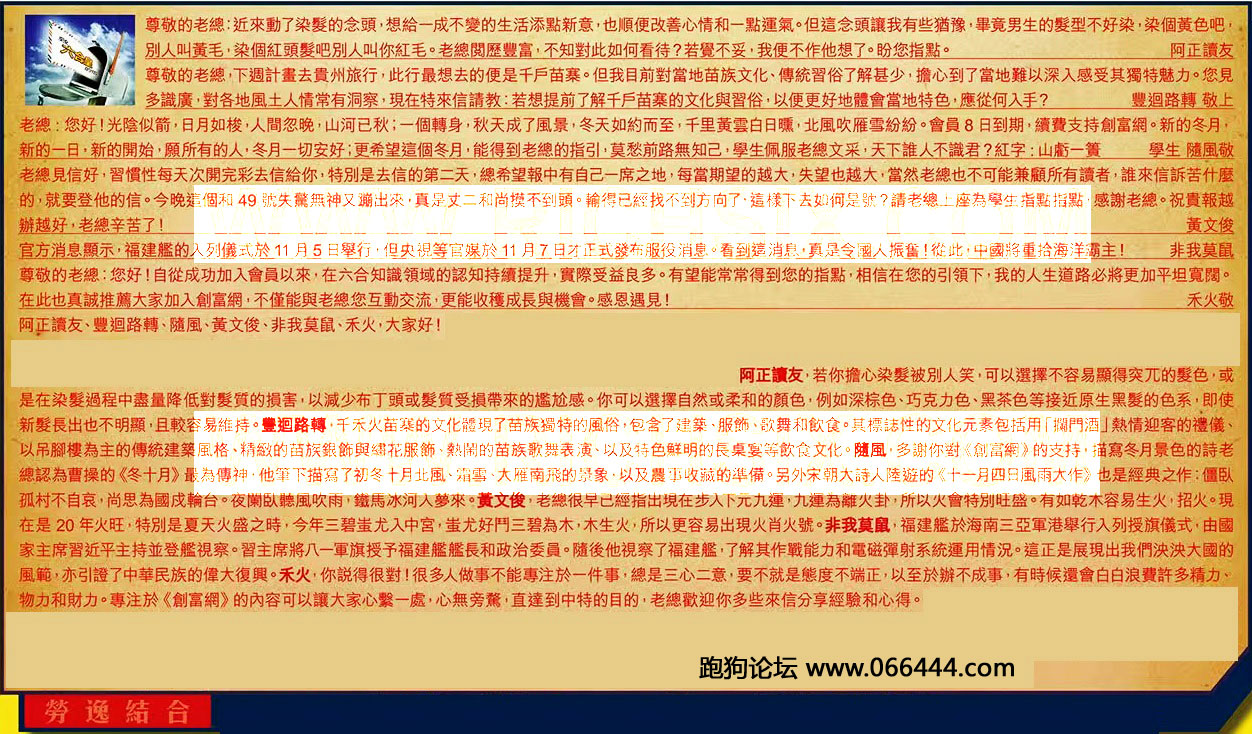 【3】.老總:您好!光陰似箭,日月如梭,人間忽晚,山河已秋;一個轉身,秋天成了風景,冬天如約而至,千里黃雲白日曛,北風吹雁雪紛紛。會員8日到期,續費支持創富網。新的冬月,新的一日,新的開始,願所有的人,冬月一切安好;更希望這個冬月,能得到老總的指引,莫愁前路無知己,學生佩服老總文采,天下誰人不識君?紅字:山虧一簧 學生 隨風 敬